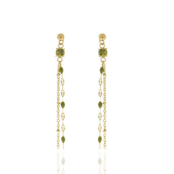 Ohrstecker, Edelstahl, vergoldet, Anhänger zweireihig 46mm lang, Stein grün 5mm, Harz grün