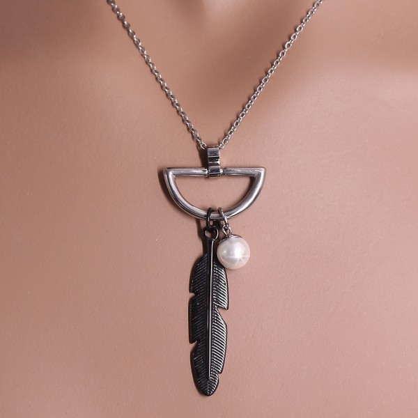Collier, Edelstahl, Perle weiß, Feder schwarz, 42 + 5 cm