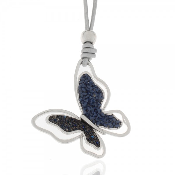 Collier, rhodiniert, Leder grau, Steine blau, nickel-cadmium-bleifrei