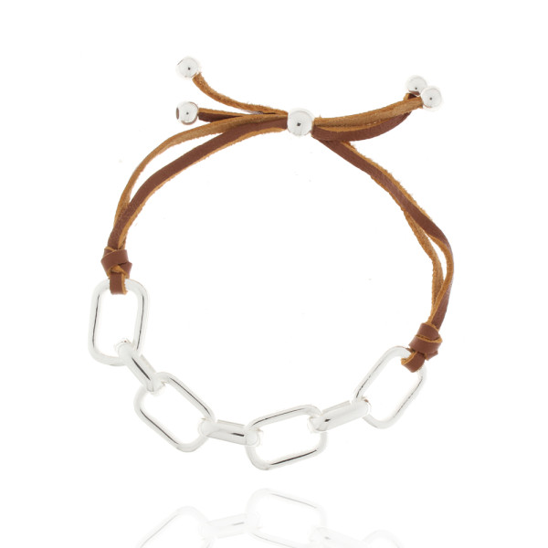 Armband versilbert, Gliederkette poliert, Lederband braun, verstellbar, nickel-cadmium-bleifrei
