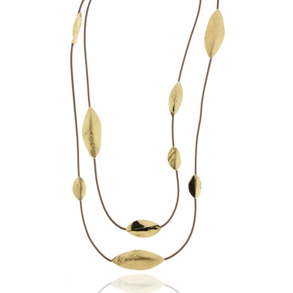 Collier vergoldet, matt/poliert, zweireihig, Blätter, Leder taupe, 80 + 7cm