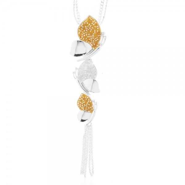 Collier, Steine gelb/weiß, Schmetterlinge, versilbert, 41 cm + 8 cm Verlängerung, nickel-cadmium-bleifrei
